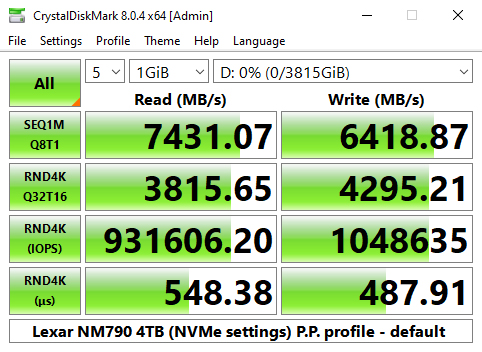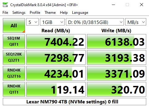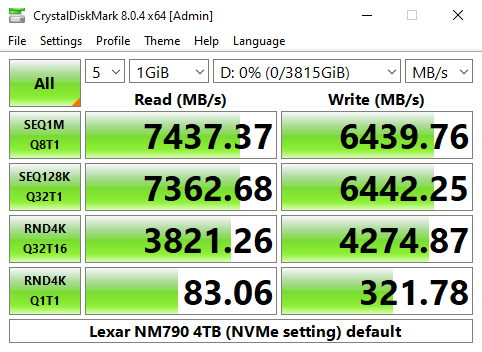 Looking at the benchmark result screens, we can confirm the official Sequential ratings of the drive of up to 7,400MB/s and up to 6,500MB/s for read and writes respectively with a best read test figure of 7,437MB/s and a best write result of 6,439MB/s. Although the write result doesn't hit the official maximum it certainly is in the ballpark.