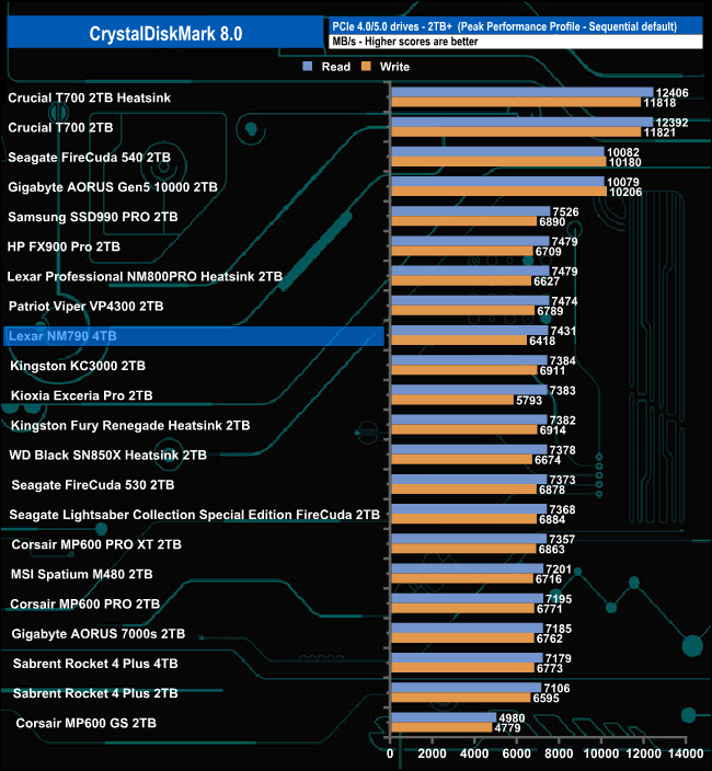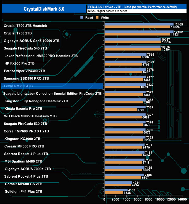 Those Sequential test results of 7,437MB/s and 6,439MB/s for read and writes respectively are good enough to see the drive in the top five of the Gen 4 consumer drives we've tested to date.