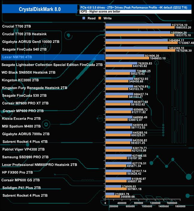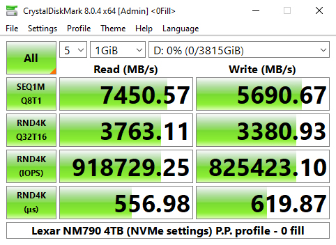 We haven't seen an official 4K random performance rating for the NM790 but the controller supports up to 1,000K IOPS for both read and writes. Using the Peak Performance profile test we saw a best-read result of 931,606 IOPS, slower than the controller rating with writes at 1,048,635 IOPS, a little faster than the official figure,