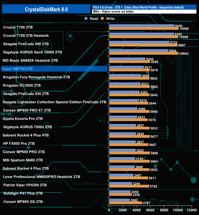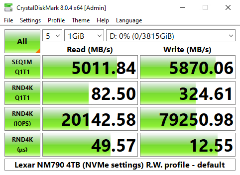 In the Real World profile default tests, the NM790 produced Sequential read/write figures of 5,011MB/s and 5,870MB/s respectively which makes it the second fastest Gen4 drive we've seen to date in this test behind WD's Black SN850X Heatsink model.