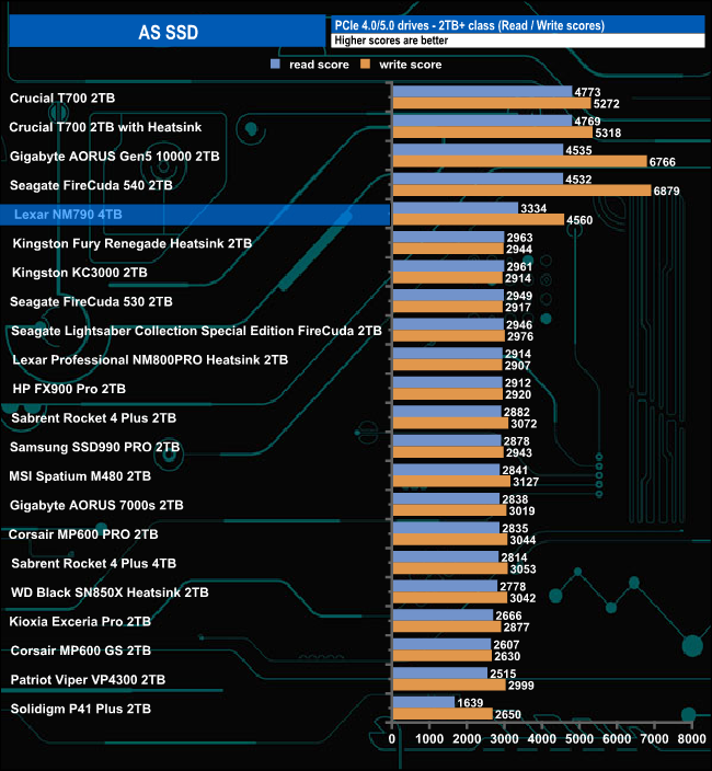 With an AS SSD read score of 3334, the 4TB version of Lexar's NM790 is the fastest Gen4 consumer drive we've seen to date. However, its write score of 4560 is even more impressive.