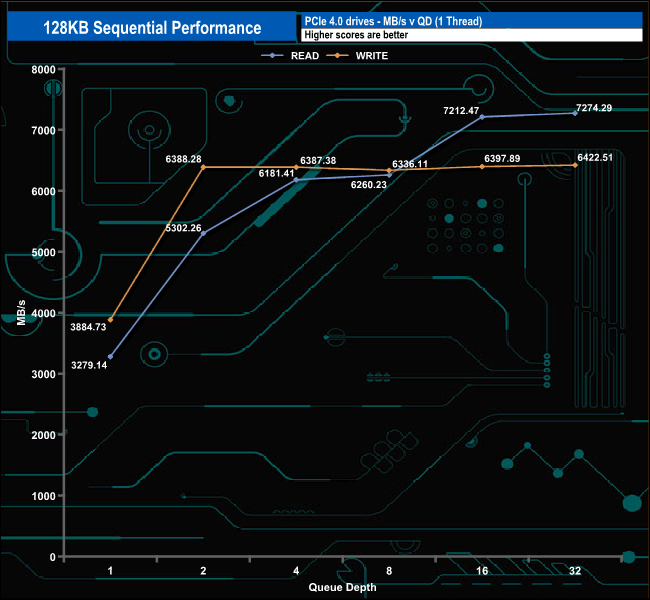 We used CrystalDiskMark 8‘s custom settings to test the Sequential read and write performance of the drive through a range of queue depths. The setup for the tests is listed below.