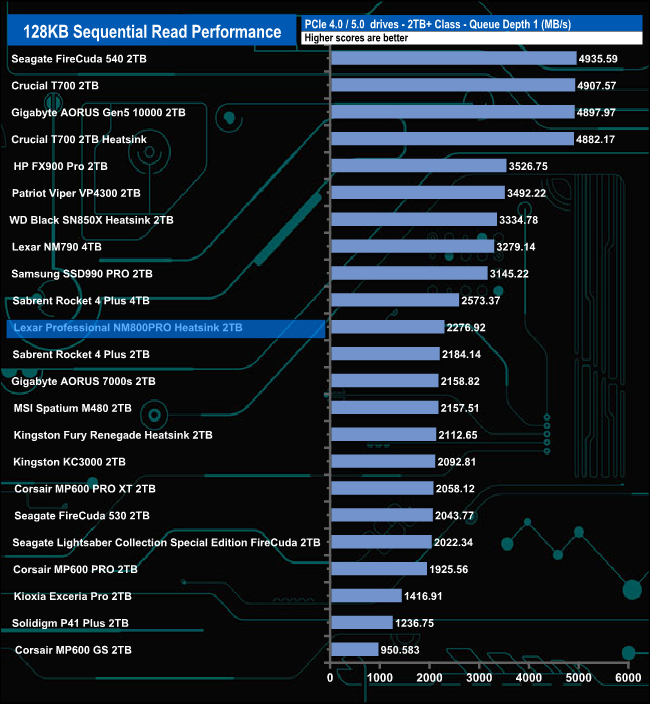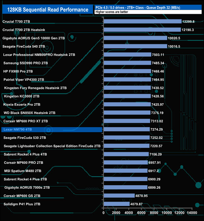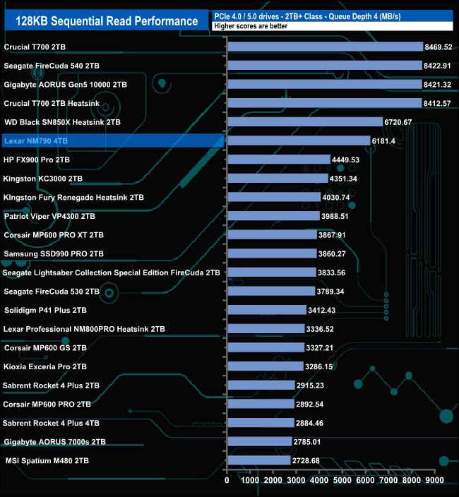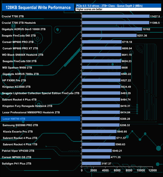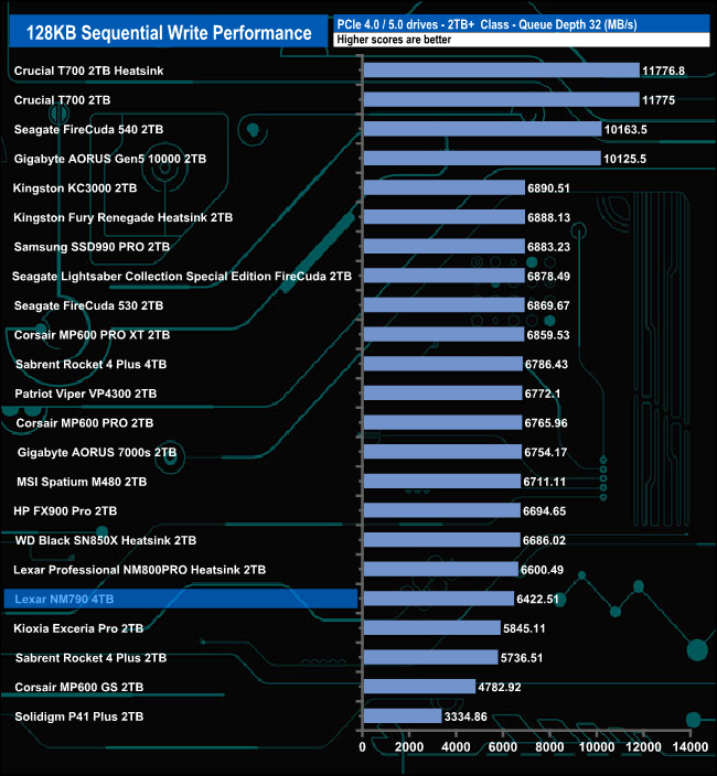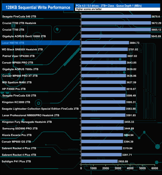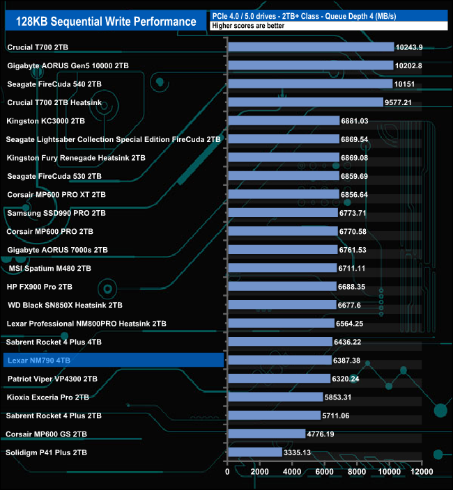 The best read performance for the NM790 in relation to the drives around it comes at QD's 2 and 4 where it sits just behind WD's Black SN850X Heatsink model towards the top of the results chart. At QD1 it sits in mid-table and at QD32 it has fallen further down the chart.