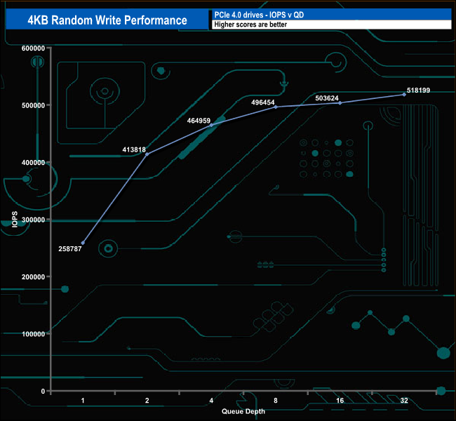 Just as with the random read performance, the controller of the drive is rated as up to 1,000K IOPs for random writes. As with the random read results with our 4-threaded tests, we couldn't get close to this figure with the best test result of 518,199 IOPS at QD32.