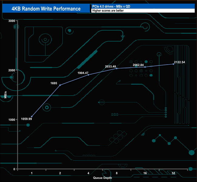 We used CrystalDiskMark 8‘s custom settings to test the 4K random write performance of the drive through a range of queue depths. The setup for the tests is listed below.