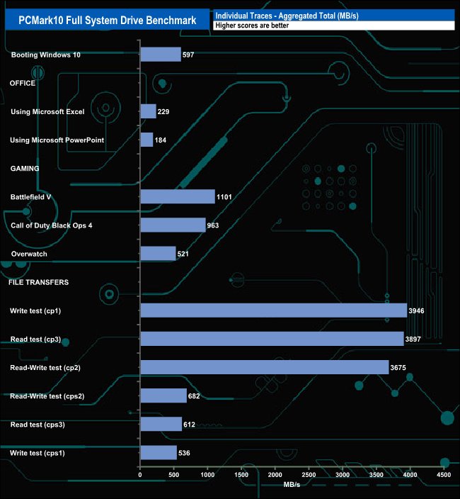 The PCMark 10 Full System Drive Benchmark uses a wide-ranging set of real-world traces from popular applications and common tasks to fully test the performance of the fastest modern drives. The benchmark is designed to measure performance of fast system drives using the SATA bus at the low end and devices connected via PCI Express at the high end.