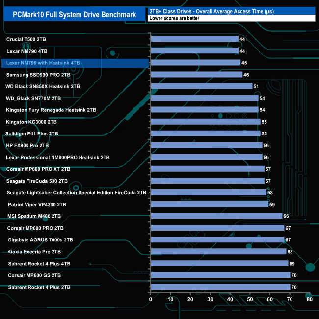 The 4TB Lexar NM790 with Heatsink displayed strong performance in PCMark10's Full System Drive Benchmark. It averaged 306MB/s for the six Adobe startup traces, the fastest being the 385MB/s for the startup test of Premiere Pro while the slowest was the Lightroom startup trace at 227MB/s.
