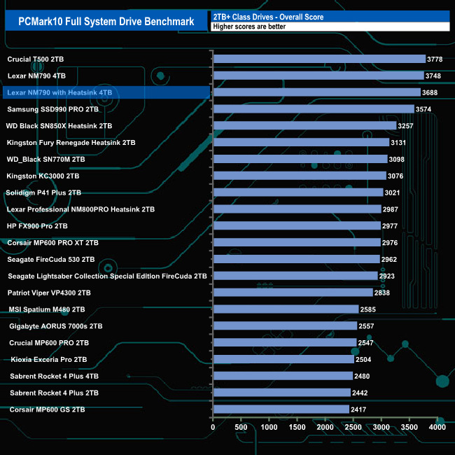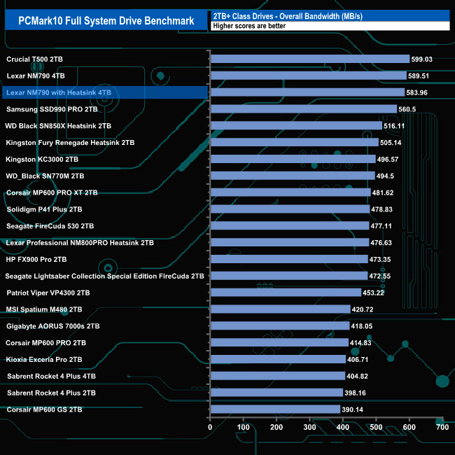 With an overall bandwidth figure of 583.96MB/s, the 4TB Lexar NM790 with Heatsink slots into the third spot on the results chart behind Crucial's T500 drive and the standard NM790.