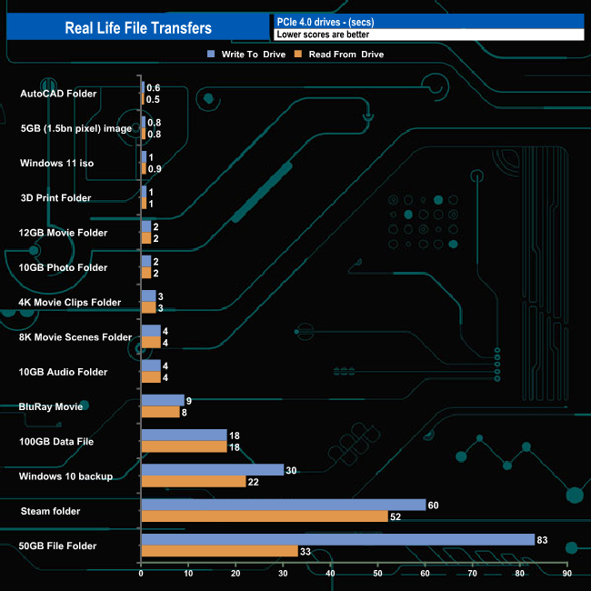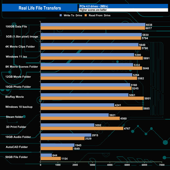 The drive averaged 2,385MB/s when writing the 14 transfer tests, with the fastest being the 6,038MB/s for the 100GB Data file transfer and the slowest being 651MB/s for the 50GB file folder transfer. Reading back the data the average was a little faster at 3,565MB/s with the faster transfer being the Windows 10 backup at 6,399MB/s. Once again the slowest transfer was the 50GB file folder at 1,661MB/s.