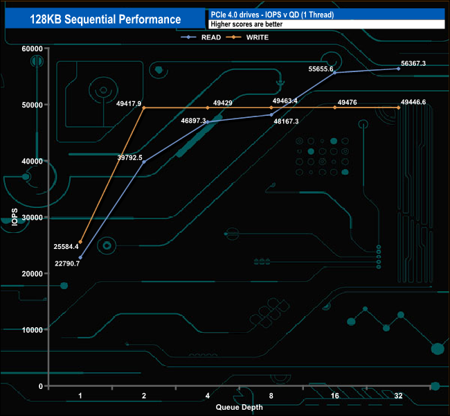 We used CrystalDiskMark 8‘s custom settings to test the Sequential read and write performance of the drive through a range of queue depths. The setup for the tests is listed below.