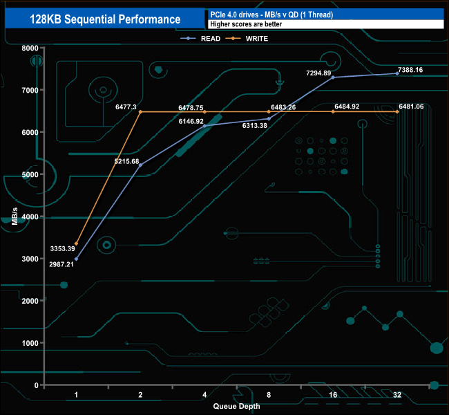 In this test, we couldn't quite hit the official maximum Sequential read and write speeds of 7,400MB/s and 6,500MB/s respectively but with a best-read result of 7,388MB/s and a best-write figure of 6,481MB/s, we got very close.