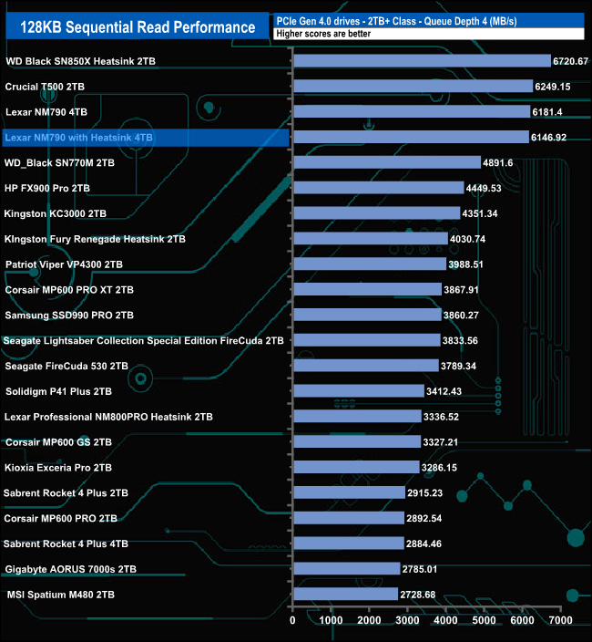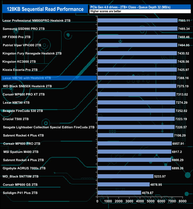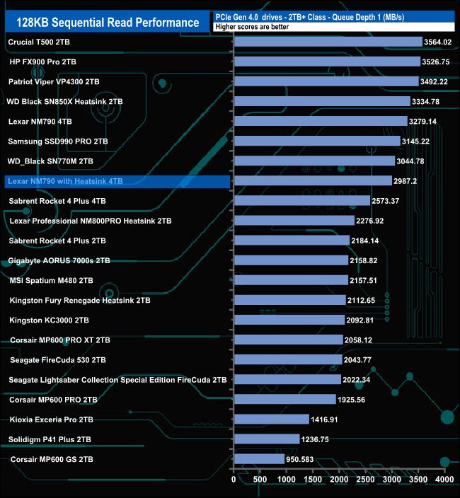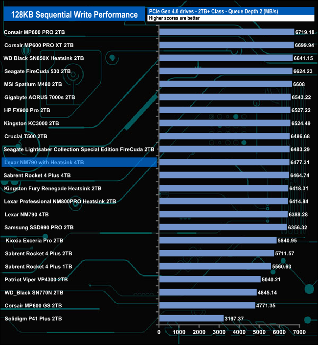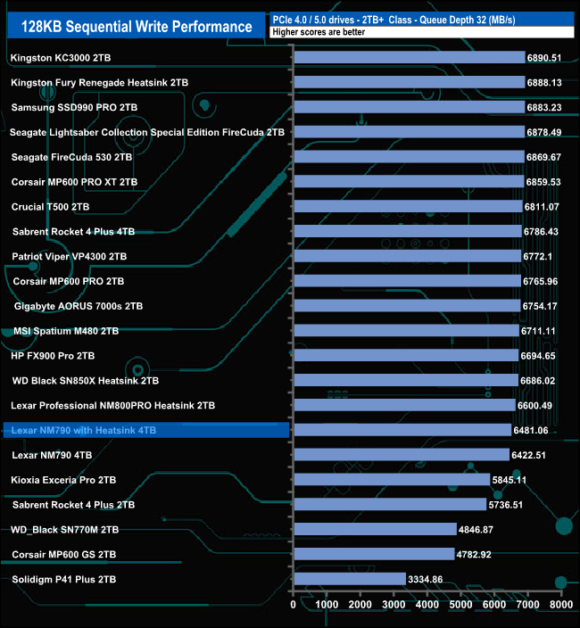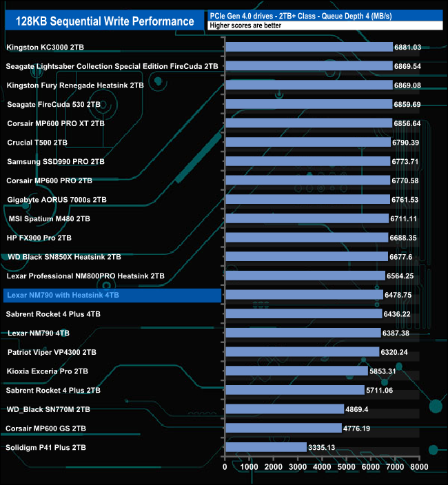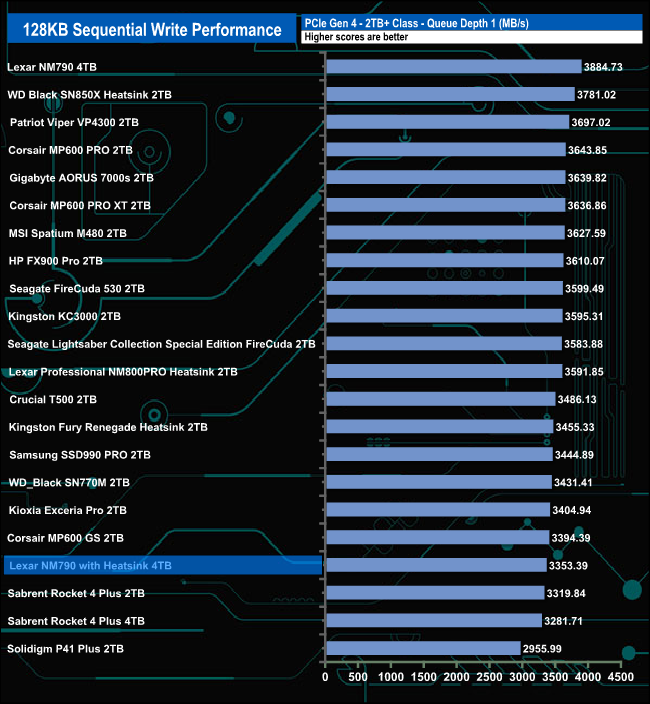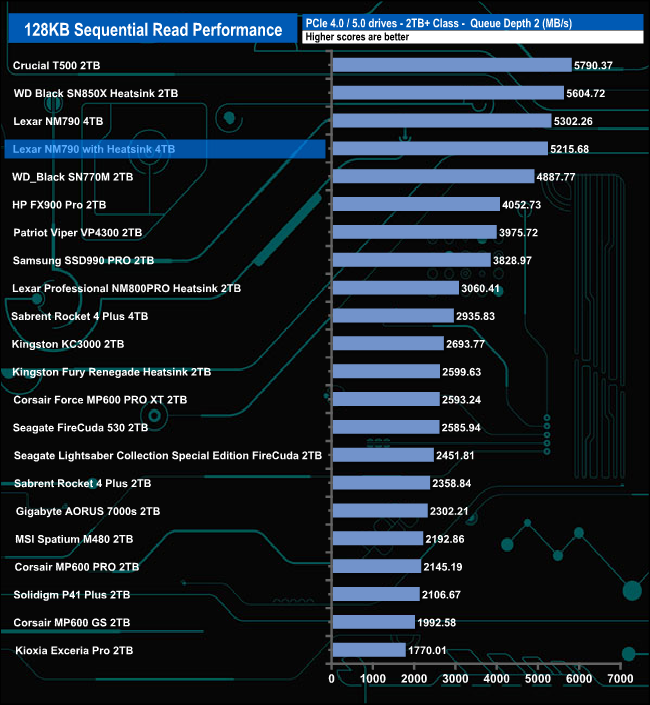The best-read performance for the NM790 with Heatsink in relation to the drives around it comes at QDs 2 and 4 where it sits in fourth place in the results chart. At QD1 and QD32, it sits just inside the top 10.