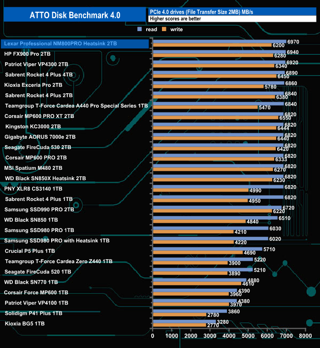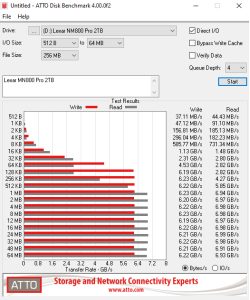 Using the ATTO benchmark we couldn't quite hit the official maximums of 7,500MB/s and 6,500MB/s for read and writes respectively with test results of 6,970MB/s for reads and 6,200MB/s for writes. However, while the tested read figure fell a little short of the official maximum it's the fastest read figure we have seen to date for a consumer drive tested with the ATTO benchmark.