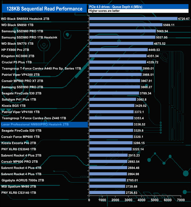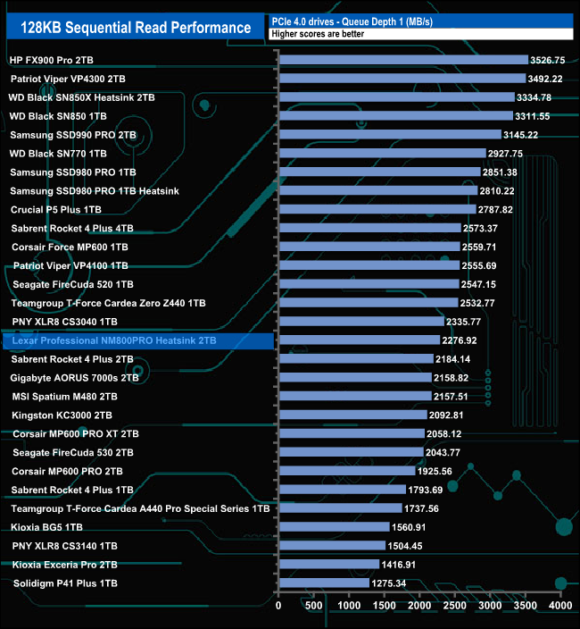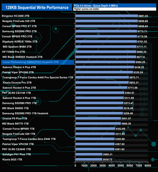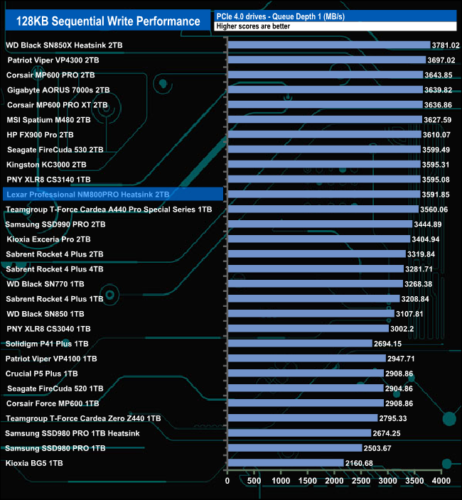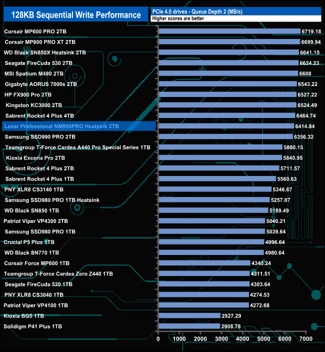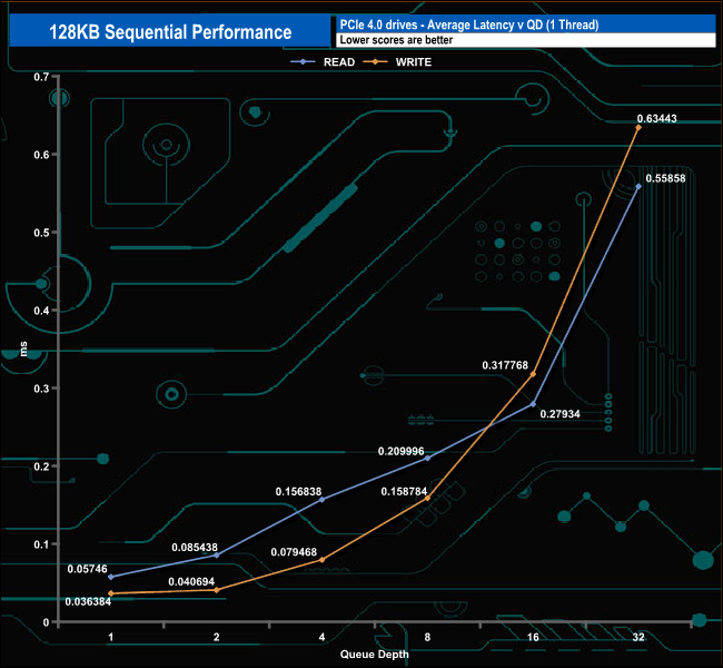 When it comes to Sequential writes, the drive sits around mid-table in our result chart for all the tested queue depths.