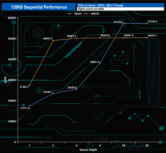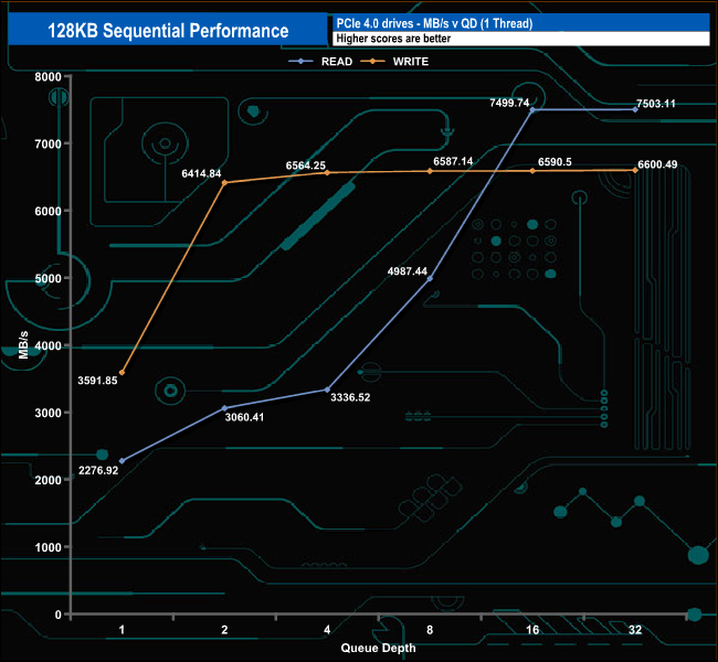 We used CrystalDiskMark 8‘s custom settings to test the Sequential read and write performance of the drive through a range of queue depths. The setup for the tests is listed below.