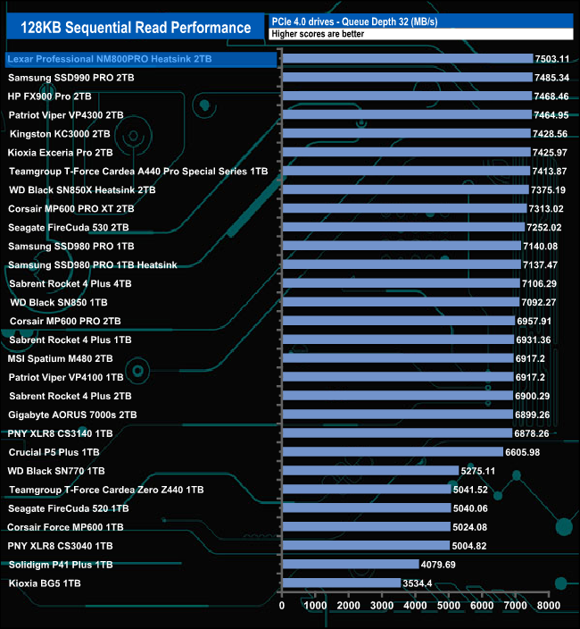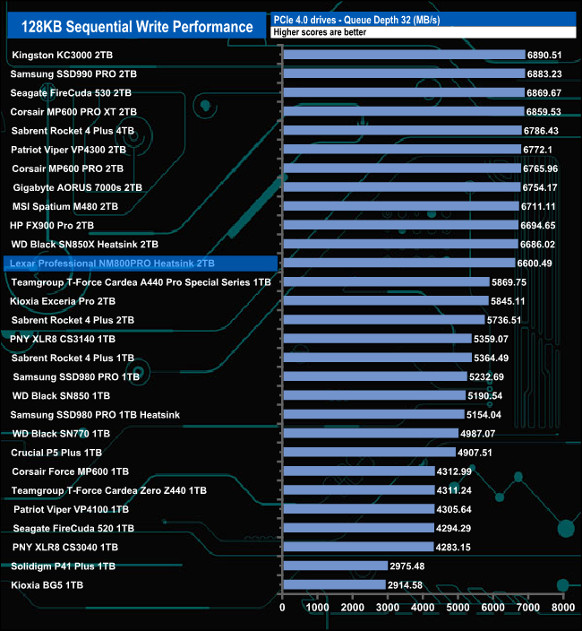 At the lower tested queue depths (1-4) the drive sits around the mid-table position in our Sequential read chart but at QD32 it sits on top of the pile.