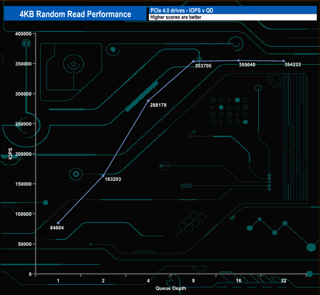 In our 4-thread 4K random read tests, the drive peaked at 355,040 IOPS at QD16 before dropping back to finish the test run at QD32 with a test result of 354,222 IOPS.