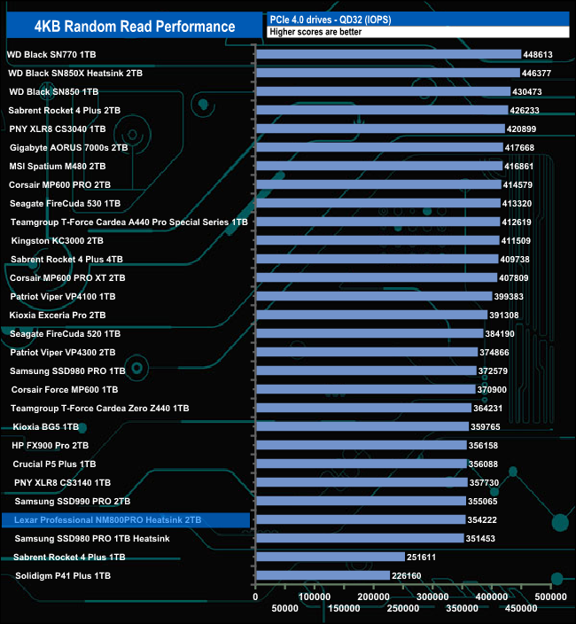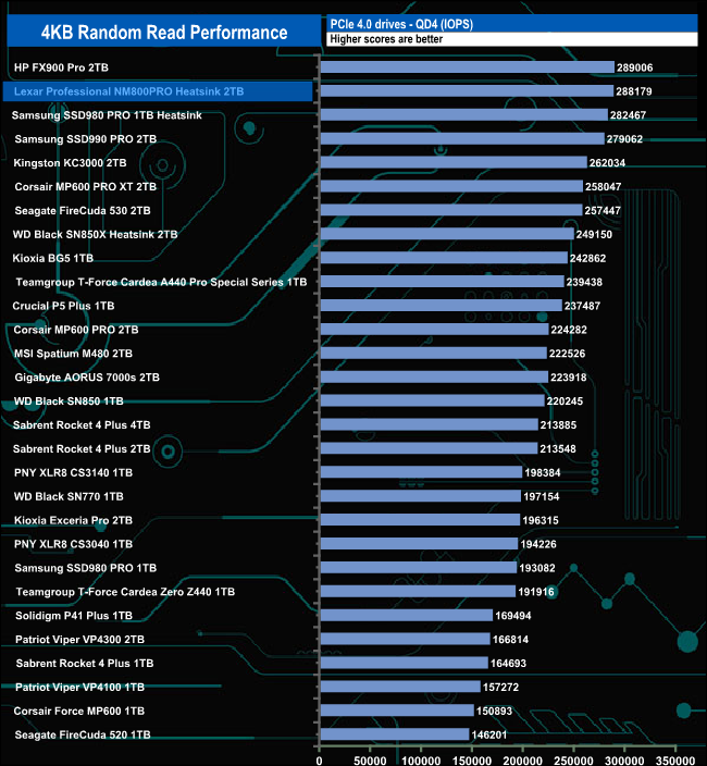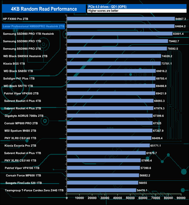 The Lexar Professional NM800 Pro Heatsink sits in second place in our results tables at QD's 1 and 4 behind the HP FX900 Pro, a drive that uses the same InnoGrit IG5236 controller. At QDs 2 and 32, the drive sits in the bottom half of the table.