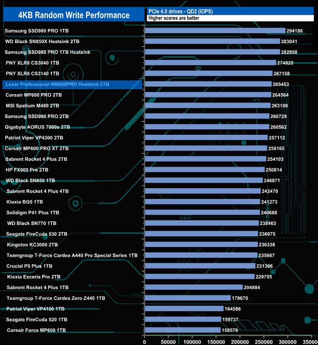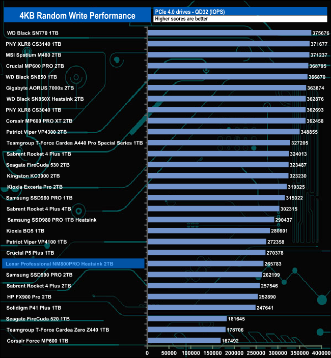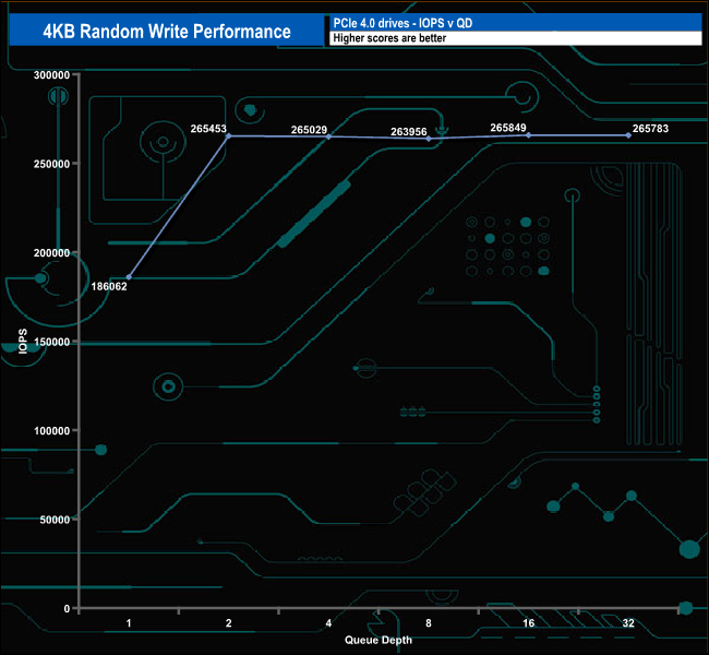 When it comes to random writes, the drive is pretty consistent in performance from QD2 to QD32, averaging 265,214 IOPS for the five tested queue depths. It peaks at QD16 with a test result of 265,849 IOPS before dropping back to finish the test run at QD32 with 265,783 IOPS.
