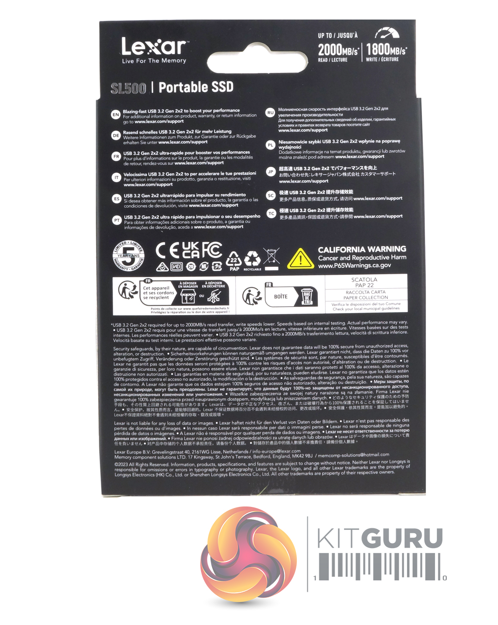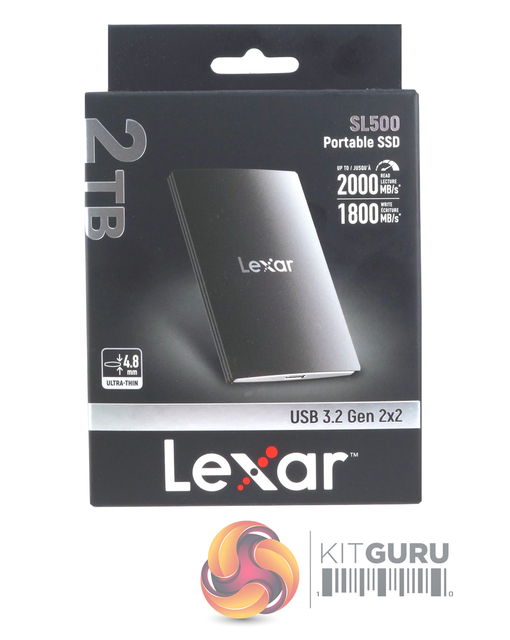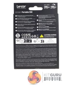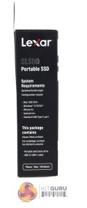 Lexar's SL500 comes in a fairly compact box with an image of the drive on the front which is about three-quarters the size of the actual drive. The drive read/write ratings are displayed to the upper right of the image. To the lower left is a small diagram showing how thin the drive is at its thinnest, while above this and along the box edge is the drive capacity. The back of the box has some multi-lingual drive information.