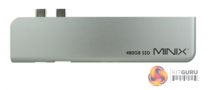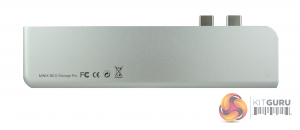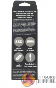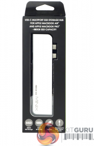 The Minix's NEO Storage Pro 480GB comes in a long, thin box with a transparent window to show the unit. At the top of the box is a description of what MacBook models the hub supports and the internal SSD's capacity. Under the window, there are four icons displaying the features of the hub; internal SSD storage and its capacity, HDMI port and supported resolution (4K @ 60Hz), single USB 3.0 ports and a Thunderbolt 3 port.