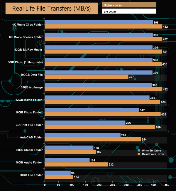 The NEO Storage Pro 480GB had no problems dealing with our real file files tests. While the internal SSD may not be a particularly fast drive, it showed consistent performance during our testing. Larger size files were read around the 430MB/s mark, faster than the official 400MB/s figure, while writes hovered around 390MB/s for the most part, slightly below the 400MB/s official figure.