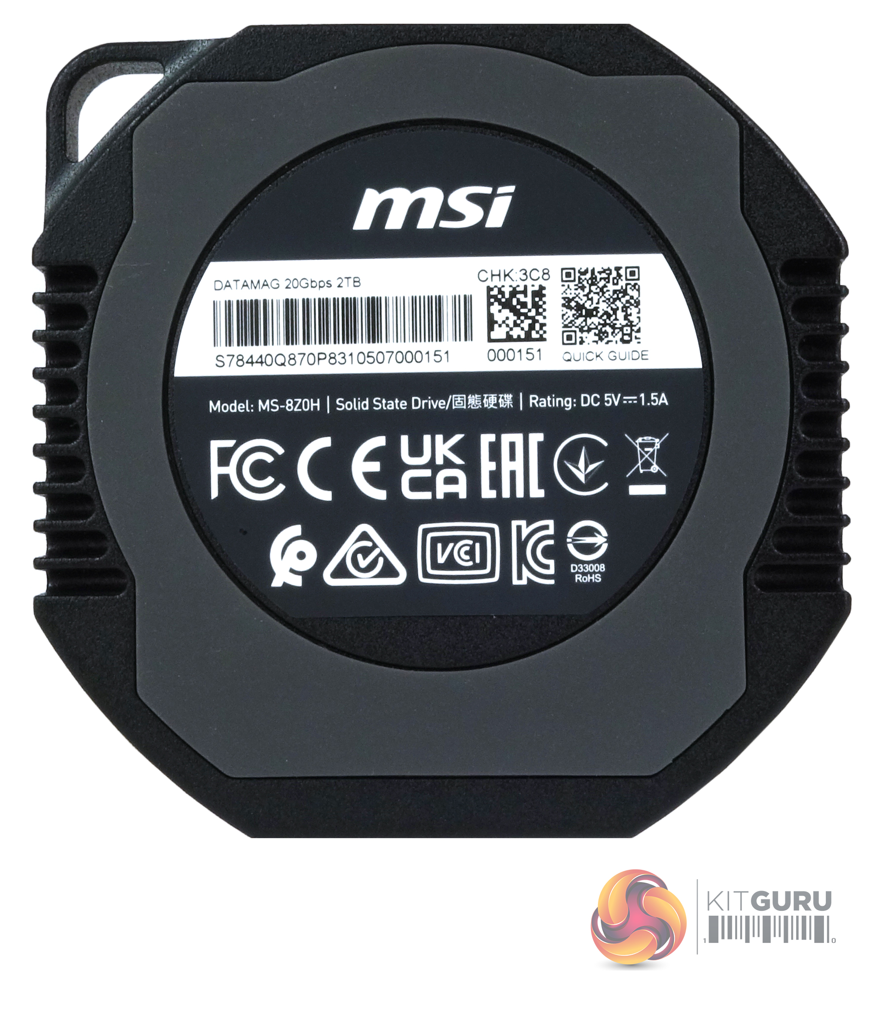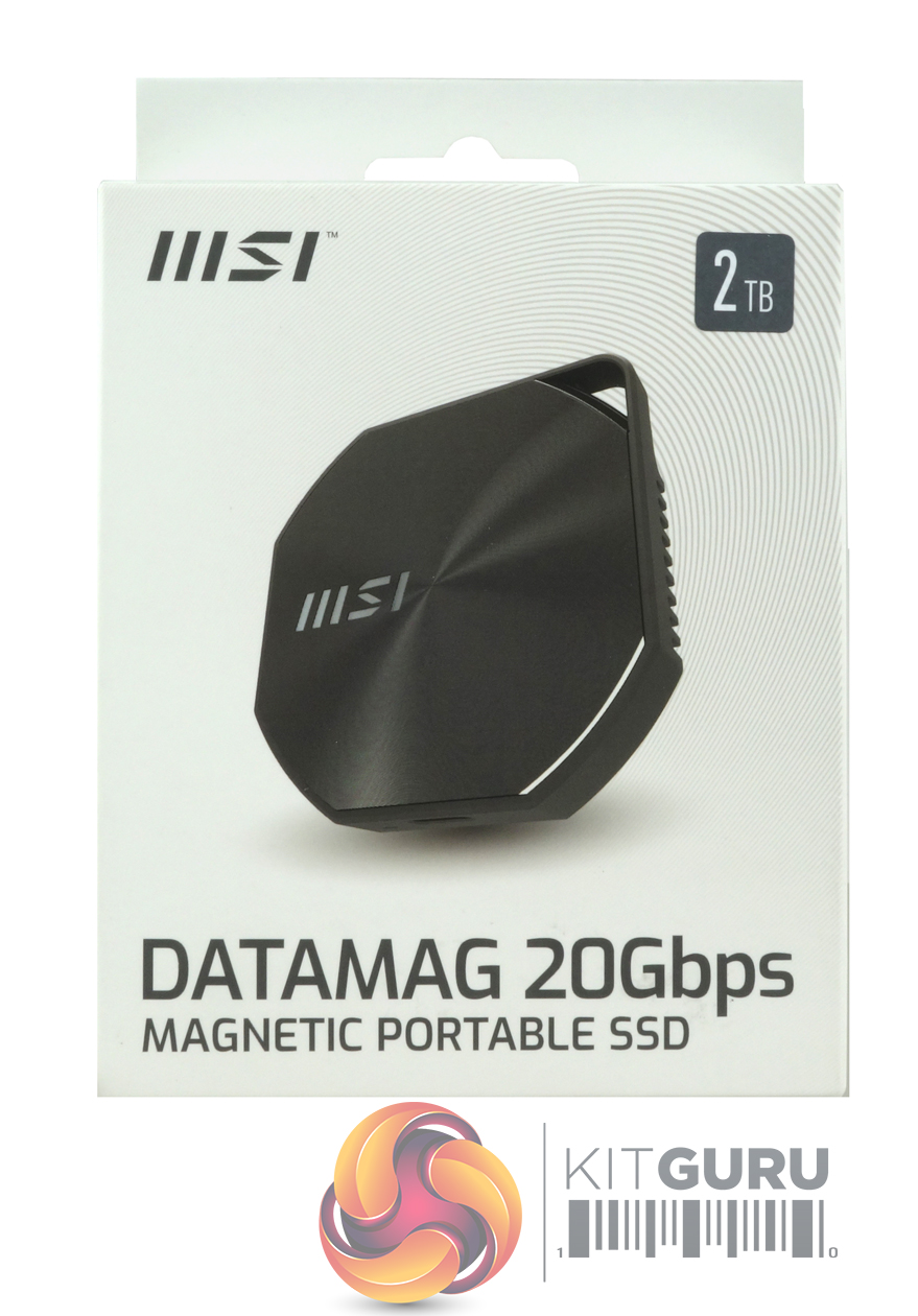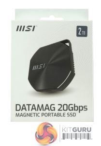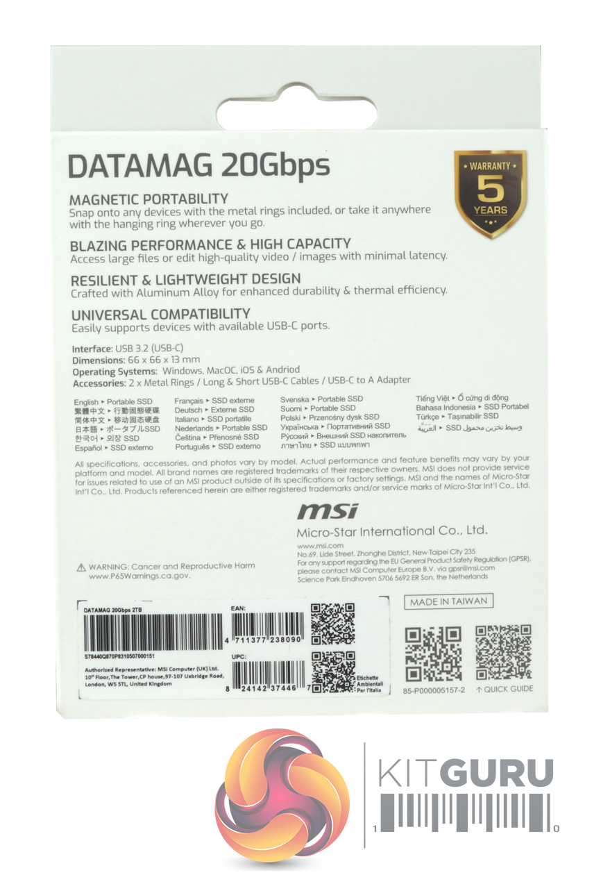 The Datamag 20Gbps comes in a compact box with a large image of the drive on the front. To the top right of the box is a label displaying the drive's capacity. At the top right-hand side of the rear of the box is a logo displaying the five-year warranty that MSI support the drive with. To the left of this is a four-point marketing list of some of the drive's features: portability, performance, design and compatibility. Under this is a four-line specification section, including the OS supported by the drive: Windows, MacOS, iOS and Android. Below is a multilingual description of the drive.