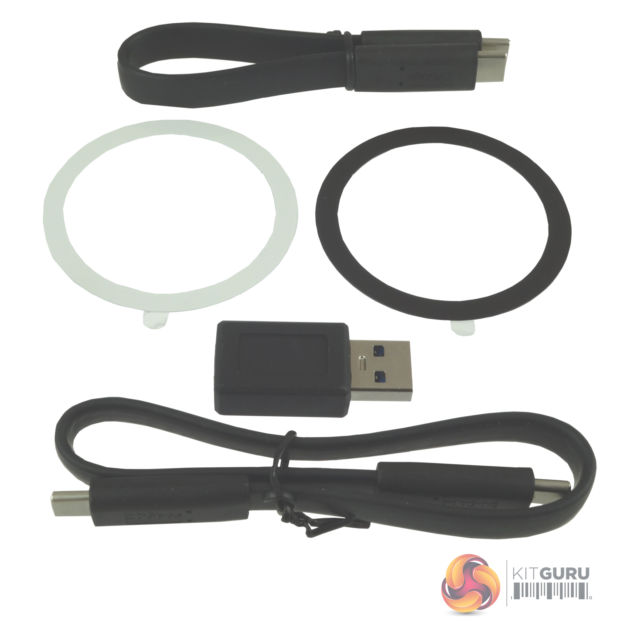 Bundled in with the drive are two metal rings (one black, one white) to attach the drive to non-ferrous devices and two USB-C cables, one short (for connecting to mobiles) and one longer one (although it's not that long) for notebooks/tablets, etc and a USB-C to A adapter.