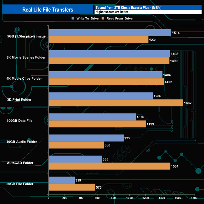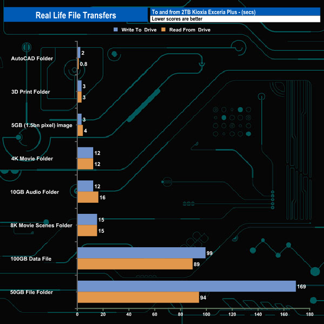 To test the real-life performance of a drive, we use a mix of folder/file types, and by using the FastCopy utility (which gives a time as well as MB/s result), we record the performance of the drive reading from & writing to a 2TB Kingston KC3000 drive.