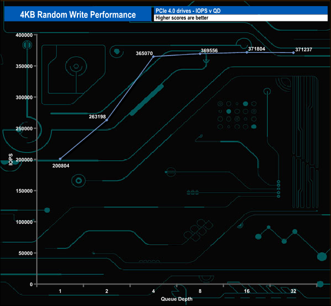 When it came to random writes, the best performance figure we saw using our 4-threaded tests was 371,804 IOPS (QD8), nowhere close to the official maximum of 700,000 IOPS. We ran a test at QD32 using 8 threads which saw the performance figure rise to 488,107.5 IOPS, still well short of the official maximum.