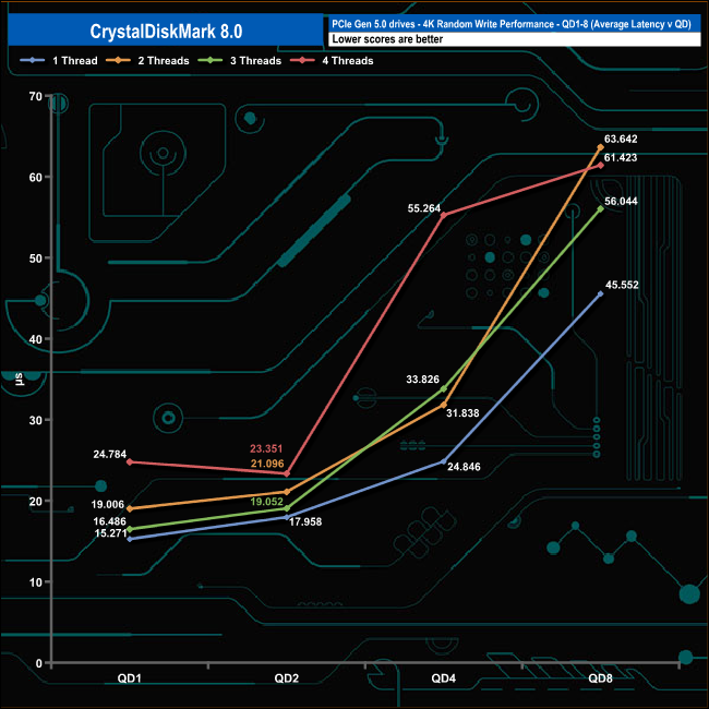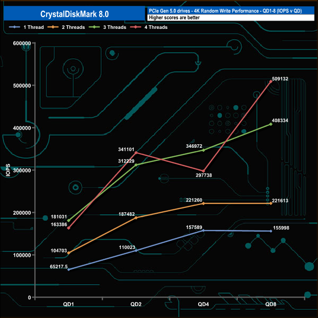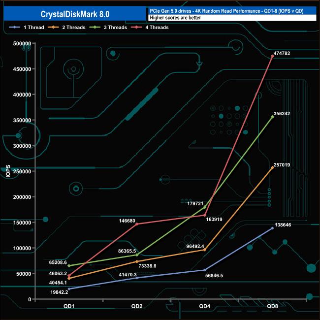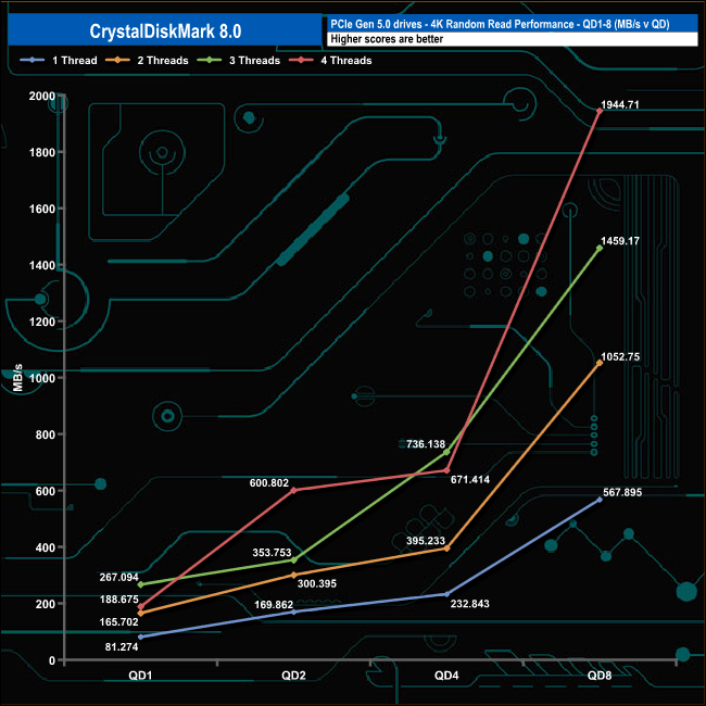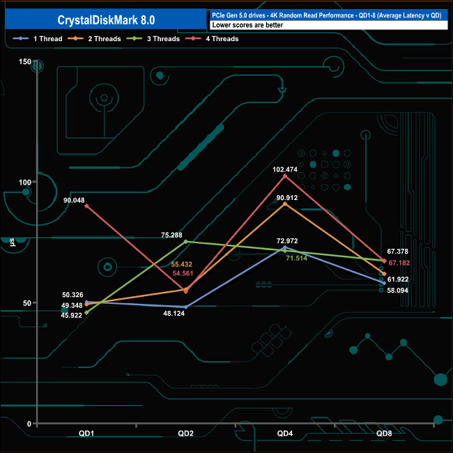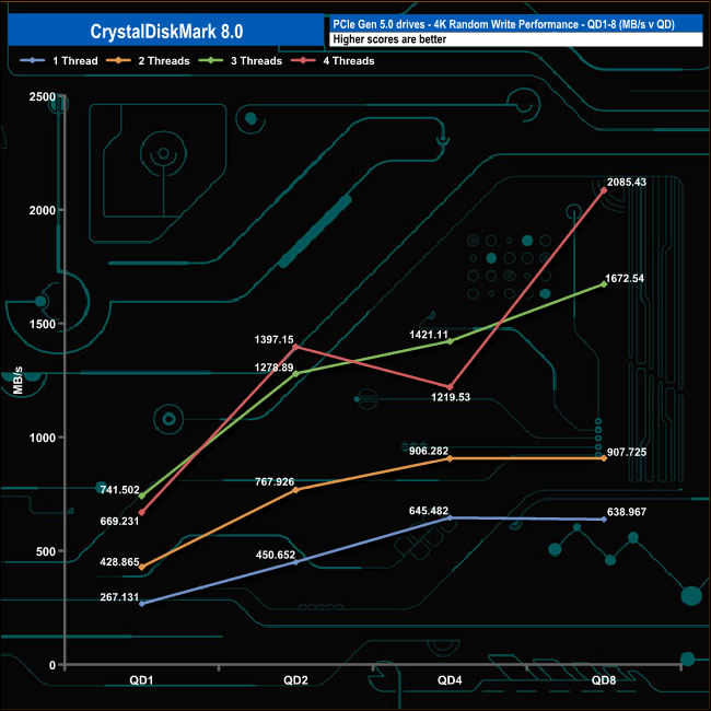 We used CrystalDiskMark 8 to test the random performance of the drive at lower queue depths (QD1 – QD8, where most of the everyday workloads occur) using 1 to 4 threads.