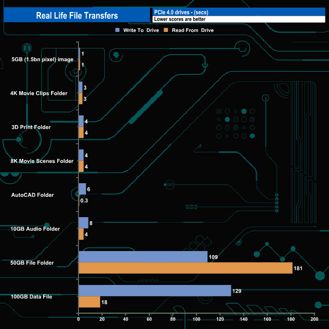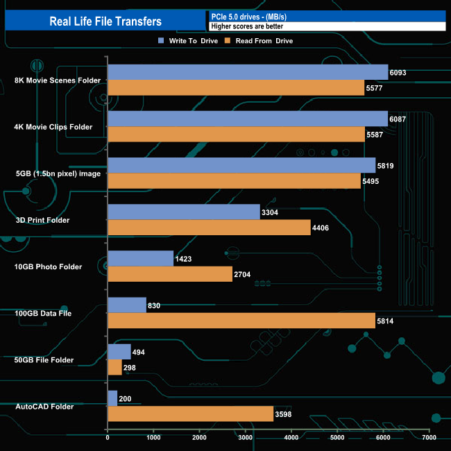 The 2TB Netac NV150HK averaged 3,031MB/s when writing the 8 transfer tests, with the fastest being the 6,093MB/s for the 8K movie folder, with the slowest being the AutoCAD folder transfer at 200MB/s. Reading back the data, the average was 4,184MB/s, with the 100GB data file transfer the fastest at 5,814MB/s and again, the slowest was the 50GB File Folder at 298MB/s.