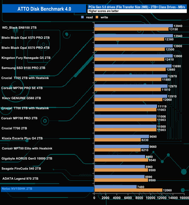 Using version 4.0.02 of the ATTO benchmark, we couldn't get close to the official read Sequential maximum of 14,000MB/s, with a test result of just over half that at 7,480MB/s. This has nothing to do with the drive; it's down to this version of ATTO and how it deals with the latest Gen 5 drives. A look at the ATTO version 5 results for the drive confirms this.