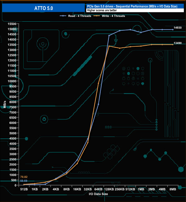 ATTO 5.0 brings new features, enhancements and changes for more accurate testing of the latest drives. Using this, we were able to confirm and even better, the official maximum Sequential figures with test results of 14,930MB/s and 13,490MB/s for reads and writes, respectively.