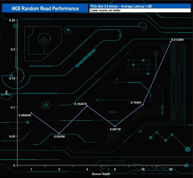 We used CrystalDiskMark 8‘s custom settings to test the 4K random read performance of the drive through a range of queue depths. The setup for the tests is listed below.