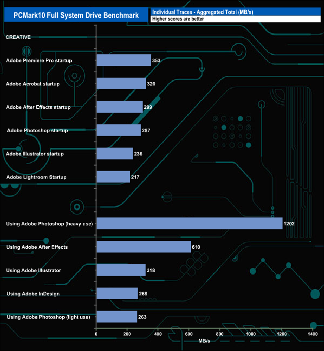 The PCMark 10 Full System Drive Benchmark uses a wide-ranging set of real-world traces from popular applications and common tasks to fully test the performance of the fastest modern drives. The benchmark is designed to measure performance of fast system drives using the SATA bus at the low end and devices connected via PCI Express at the high end.