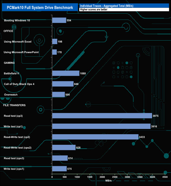 The drive averaged 809MB/s for the three gaming test traces, the fastest being Battlefield V at 1,080MB/s with Call Of Duty Black Ops 4 the next fastest at 848MB/s and finally Overwatch at 500MB/s. When it came to the file transfers, the fastest was the cp3 Read test at 3,075MB/s with the drive averaging 2,090MB/s for the six file transfer tests.