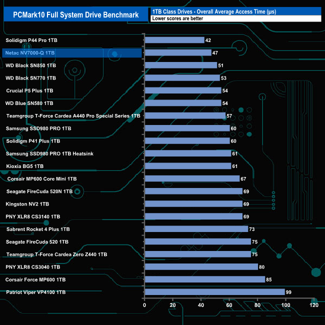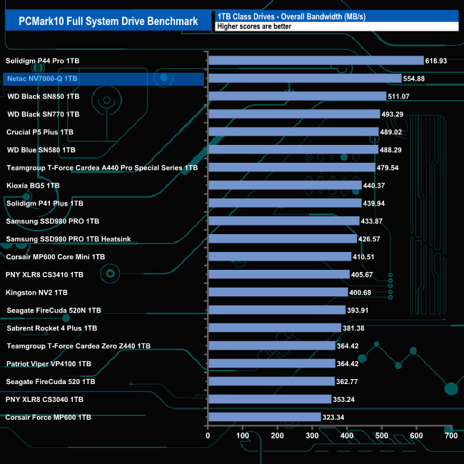 With an overall bandwidth figure of 554.88MB/s, the 1TB Netac NV7000-Q slots into the second spot on the results chart behind Solidigm's P44 Pro drive.
