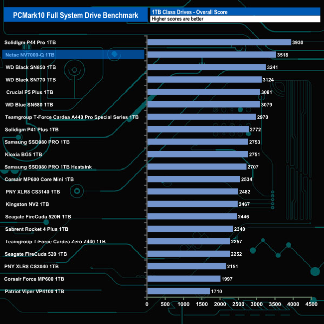 The 1TB Netac NV7000-Q performed pretty well in PCMark10's Full System Drive Benchmark. It averaged 252MB/s for the six Adobe startup traces, the fastest being 353MB/s for the startup test trace of Premiere Pro, the slowest being the Lightroom startup trace. For the Adobe usage traces it averaged 532MB/s for the five tests, with the fastest being the 1,202MB/s for the Adobe Photoshop heavy usage trace.