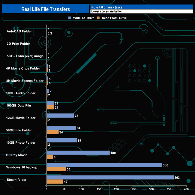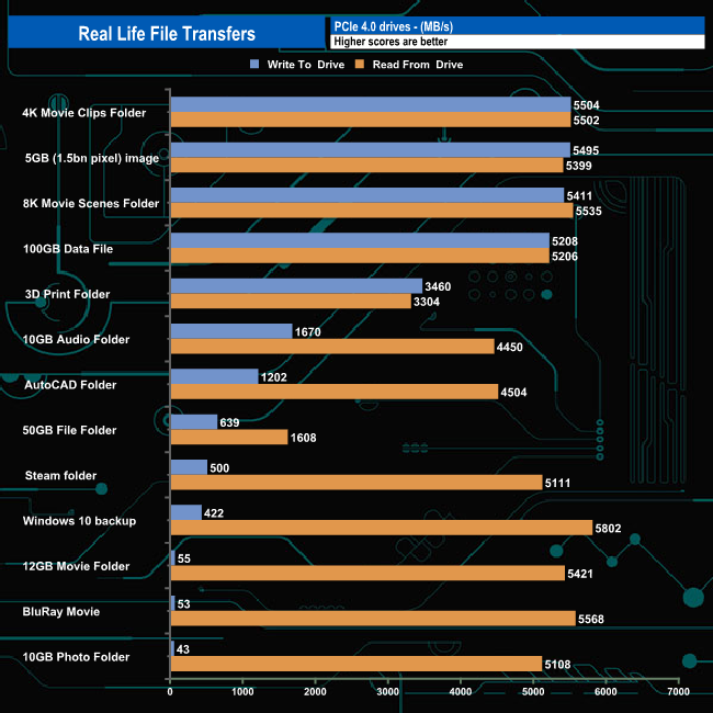 The drive averaged 2,281MB/s when writing the 13 transfer tests, with the fastest being 5,504MB/s for the 4K Movie Clip folder. The drive seemed to have problems when writing the contents of the 12GB Movie, BluRay and 10GB Photo folders as these were very slow. The drive was much more efficient reading back the data with the average for the 13 tests being 4,819MB/s. The fastest read performance came from the Windows 10 backup while the slowest was the 50GB File Transfer.