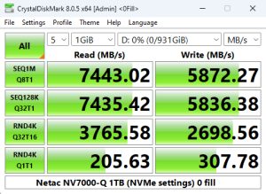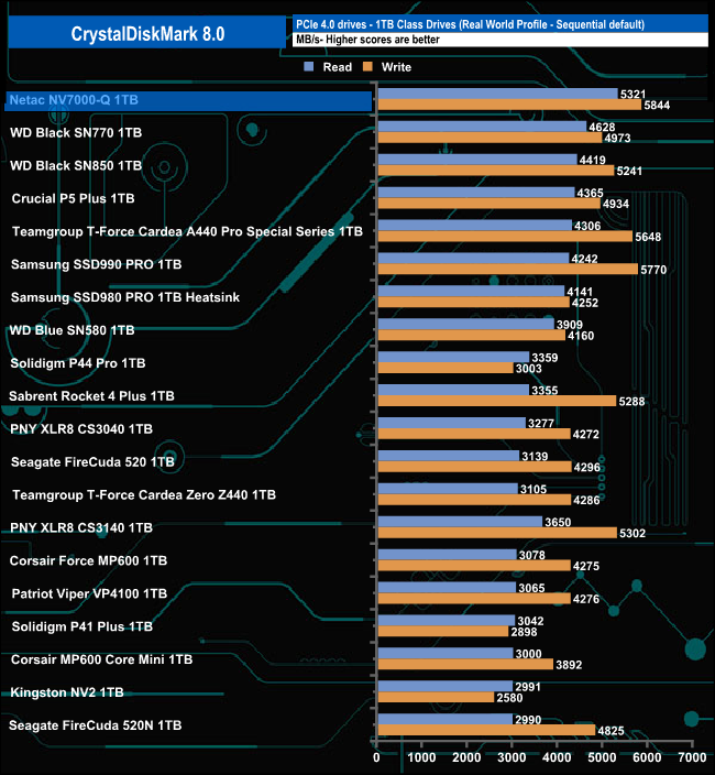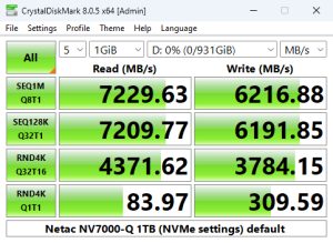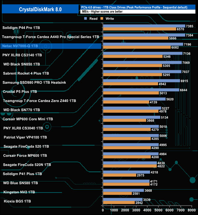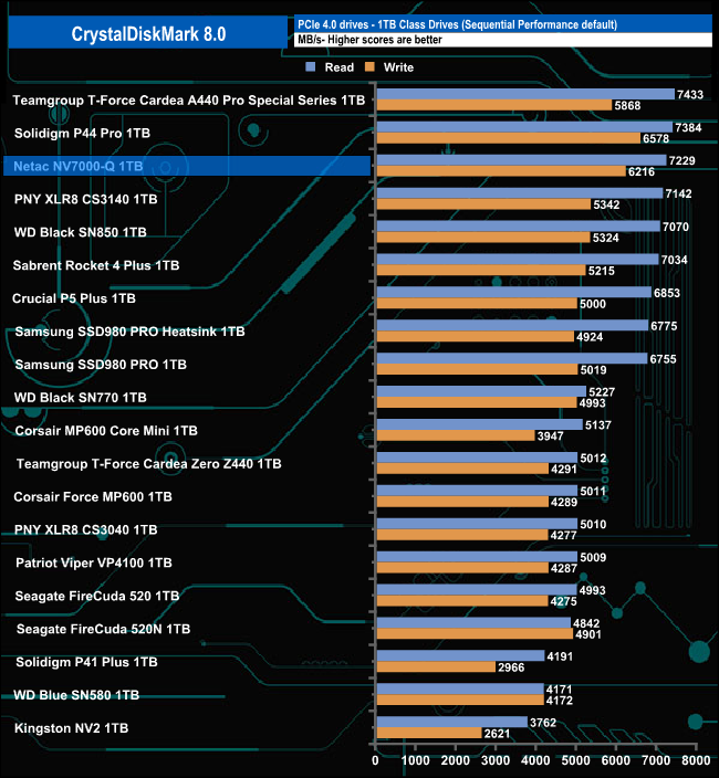 The NV7000-Q's Sequential read test result of 7,229MB/s puts the drive into third place on our results table with the second-best write score to date (for a 1TB class drive) of 6,216MB/s.