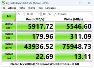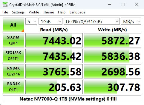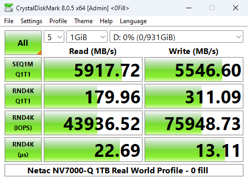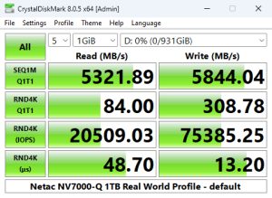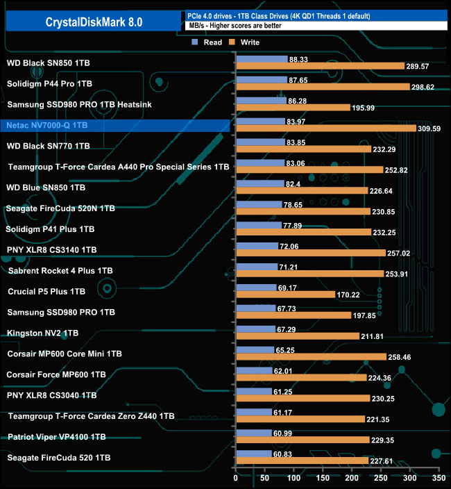 Netac's NV7000-Q read score of 83.97MB/s in CrystalDiskMark 8's 4K QD1 test sees it in the top five of our results chart. However, its write score of 309.59MB/s is the fastest we've seen in this test for a 1TB class Gen 4 drive to date.