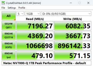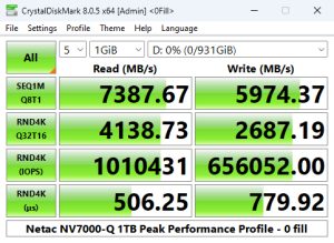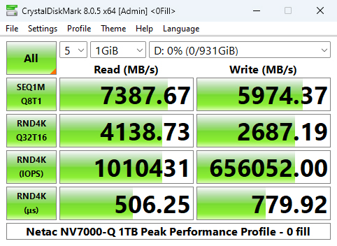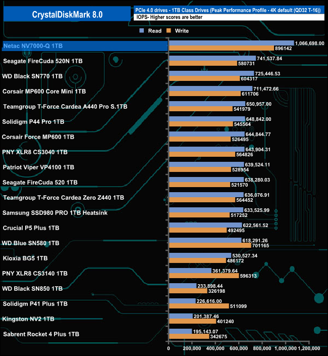 We couldn't find an official 4K rating for the drive but the controller is rated up to 1,000,000 IOPS for both reads and writes. When tested with the Peak Performance profile test in CrystalDiskMark8 we could confirm the maximum read figure with a test result of 1,066,698 IOPS. Tested write performance on the other hand came up short with a best result of 896,142 IOPS.