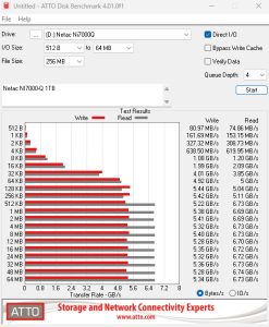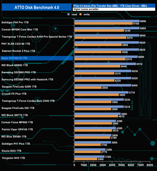 With the ATTO benchmark results the drive fell short of the official 7,100MB/s and 6,200MB/s for reads and writes respectively, with reads at 6,690MB/s and writes at 5,410MB/s but the drive still made the top10 in our results chart.