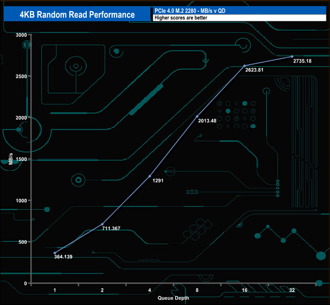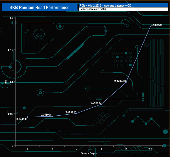 We used CrystalDiskMark 8‘s custom settings to test the 4K random read performance of the drive through a range of queue depths. The setup for the tests is listed below.