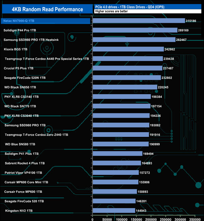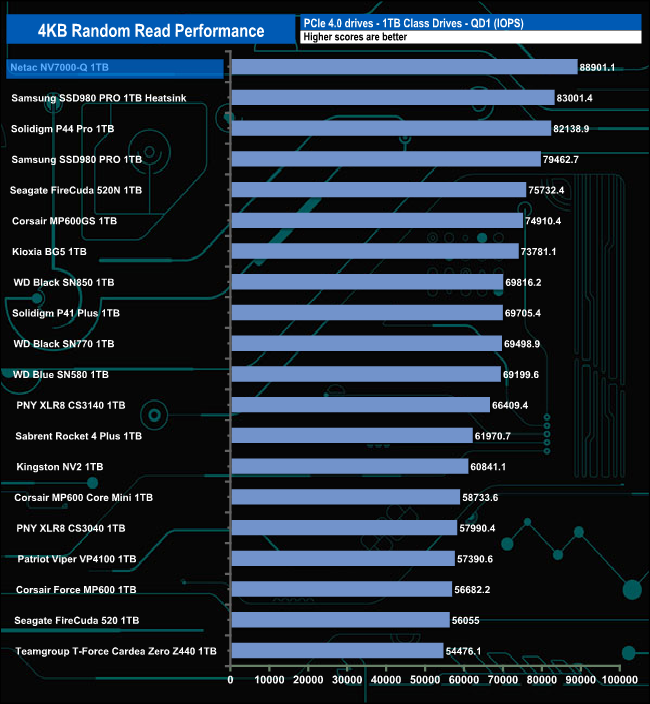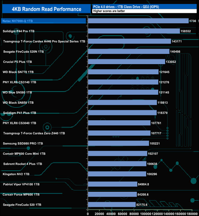 Although we couldn't get close to the official 4K random read figure, the test results we did get make the Netac NV7000-Q the fastest 1TB Gen 4 drive we've seen to date at every tested queue depth.
