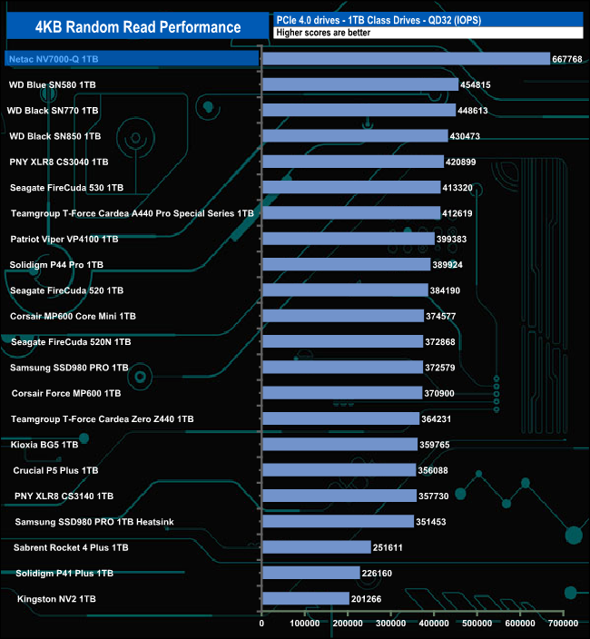 Officially the Netac NV7000-Q is rated as up to 1,000,000 IOPS for 4K random reads. With our four-threaded tests, we couldn't get close to the official figure with a peak test result of 667,768 IOPS (QD32).