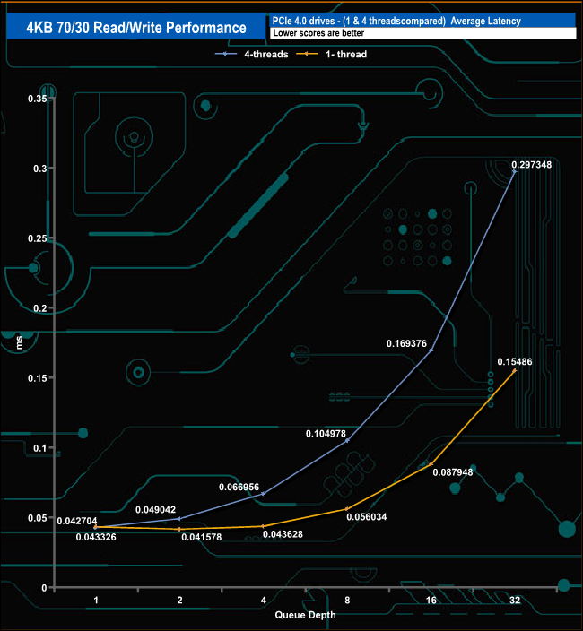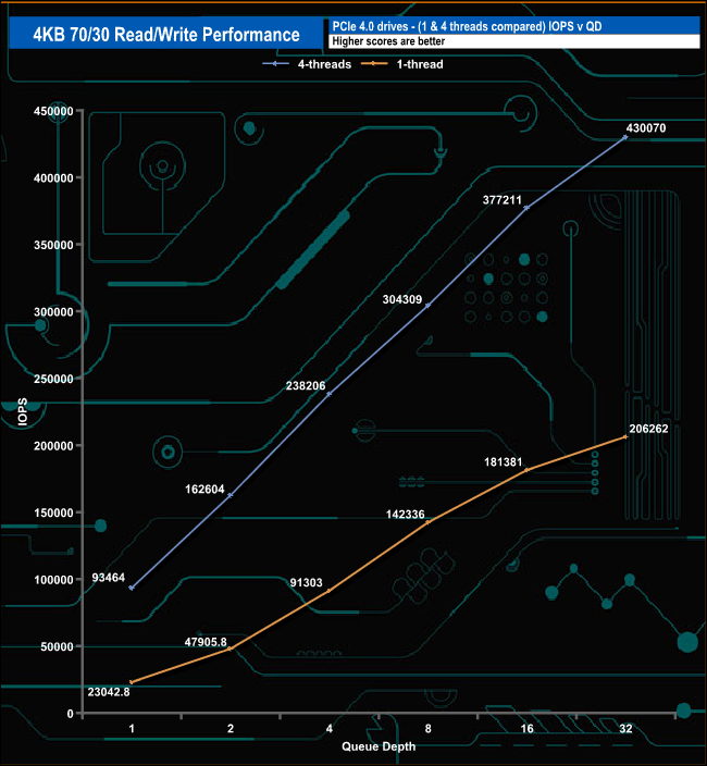 We used CrystalDiskMark 8’s custom settings to test the 4K 70/30 mixed read/write performance of the drive through a range of queue depths using a single thread and four threads.
