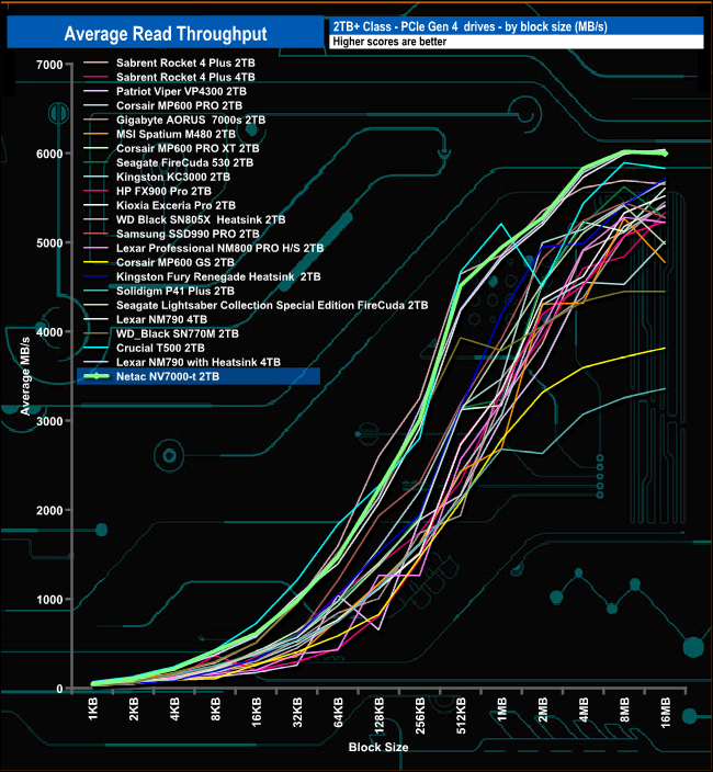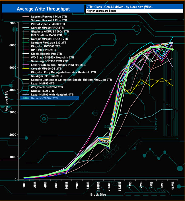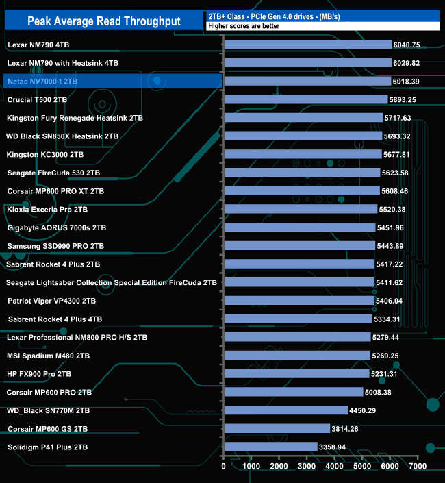 Even though the peak test result figure of 6,018.39MB/s is well short of the official maximum for the drive, that peak result is good enough to make the 2TB Netac NV7000-t the third fastest Gen4 drive we've tested to date.
