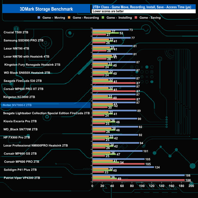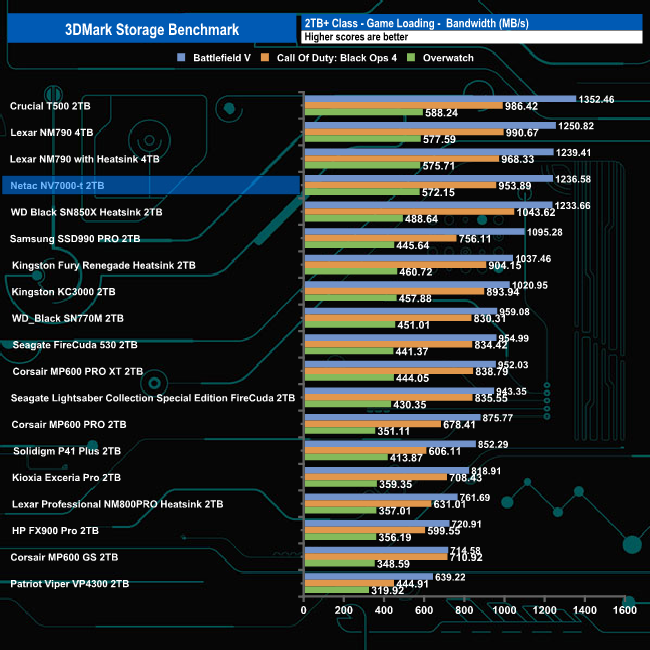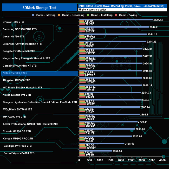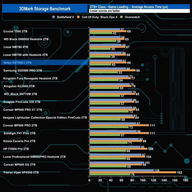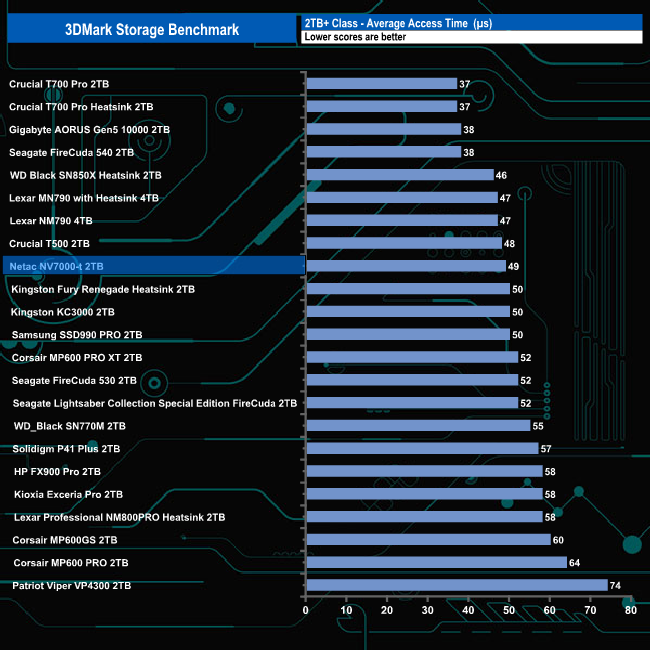 In 3DMark’s Storage Test, the NV7000-t had an average game loading bandwidth figure for the three games of 920.87MB/s which is the fourth fastest average for a Gen4 drive with an average access time of 57µs.